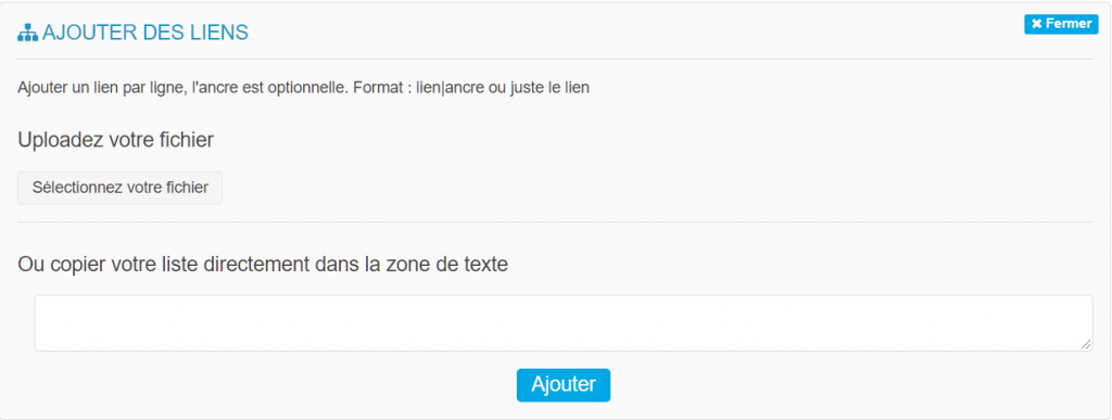 Vous avez le choix d’ajouter vos liens de deux façons : soit à la main, ligne par ligne, en respectant le format indiqué, soit à travers un fichier CSV en respectant le même format.
