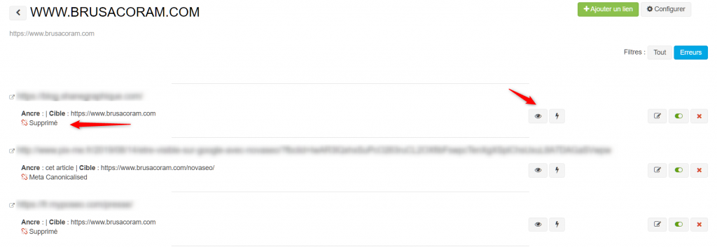 En cliquant sur le bouton avec l’icône de menu burger « tous les liens », vous pouvez administrer vos liens, constater les potentielles erreurs, voir à quel moment le lien est passé en erreur et pourquoi (suppression, modification de l’url…).